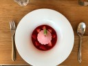 Iced strawberry soufflé with melba sauce
