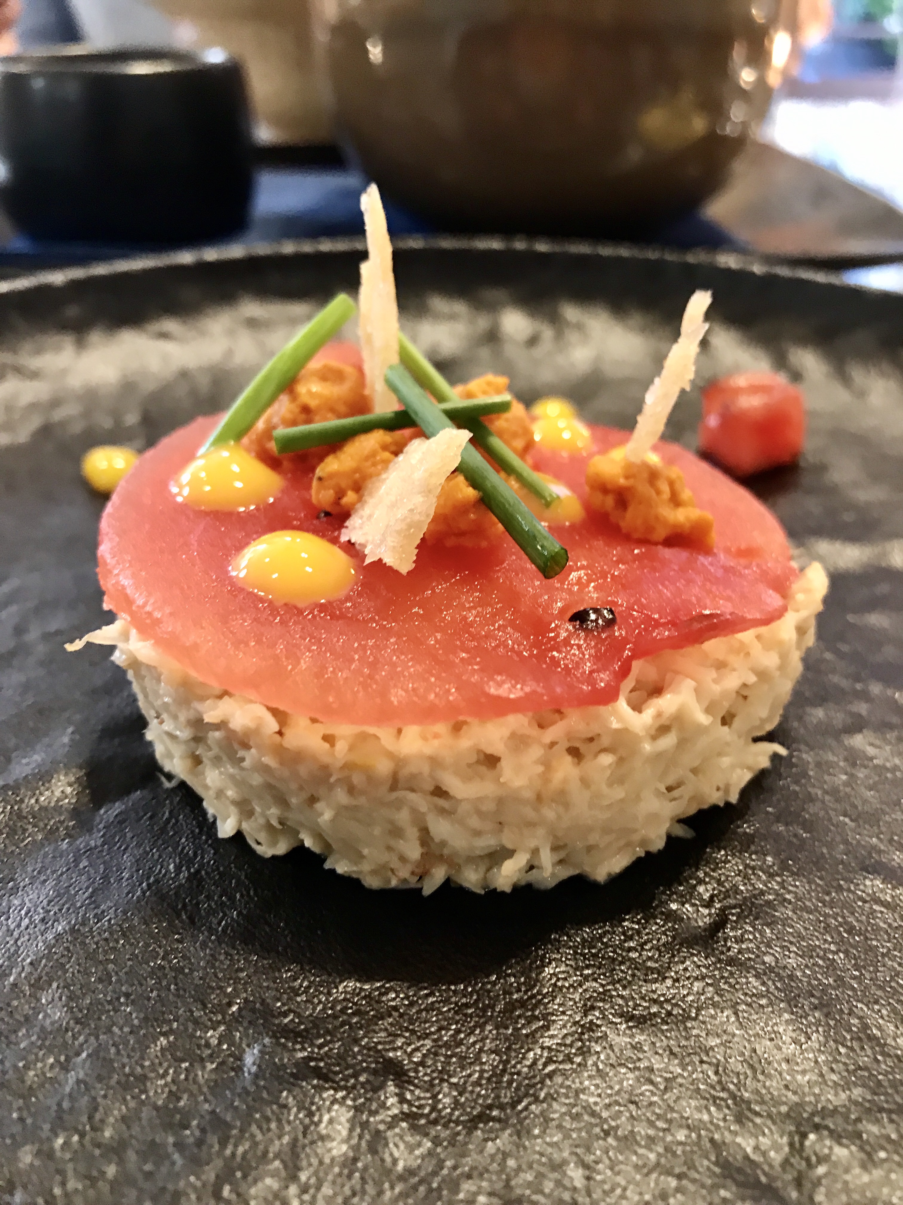 Dressed Dorset Crab meat, brown crab mousse, watermelon, confit yolk