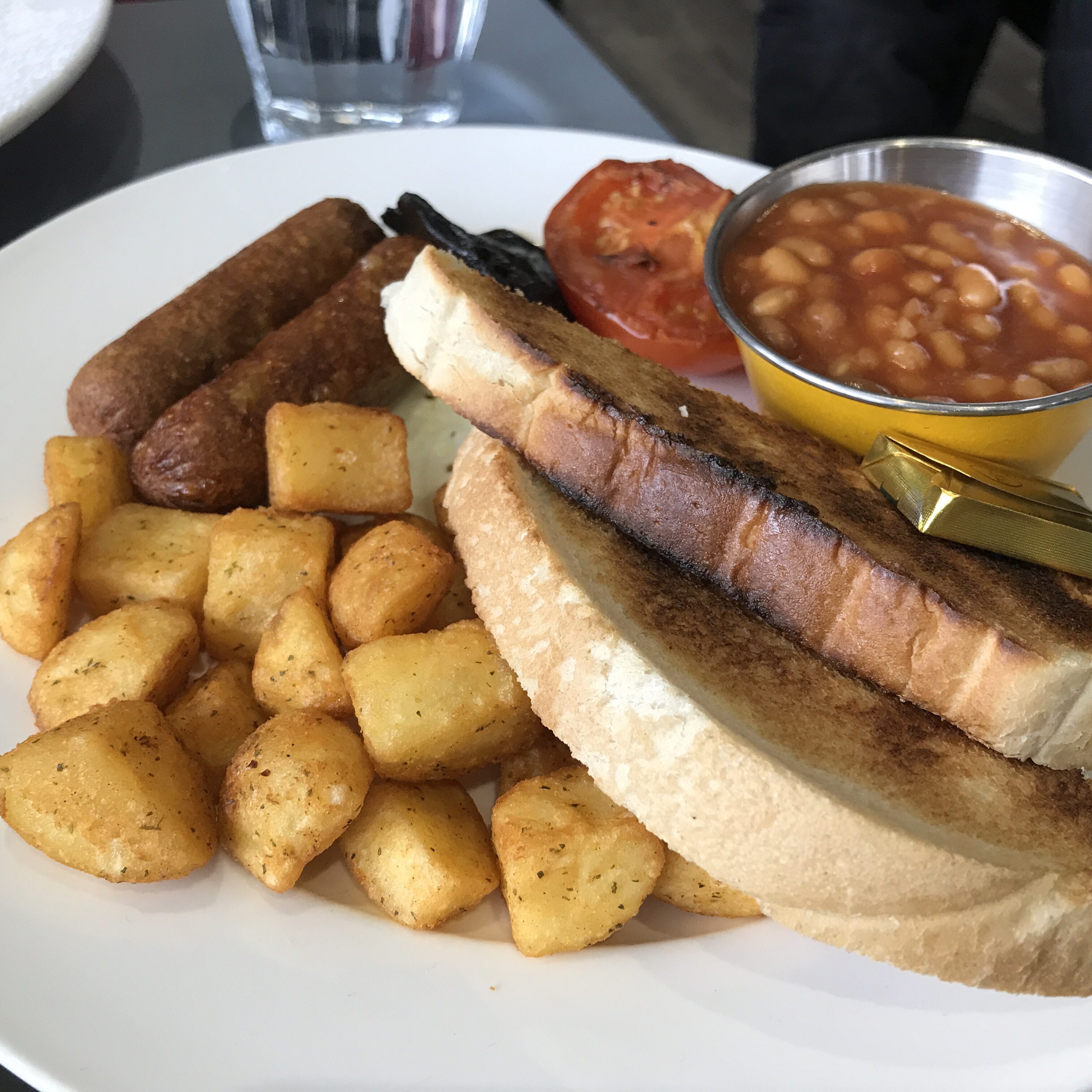 2 Veggie Sausages, Free Range Egg, Grilled Tomato, Flat Mushroom, Baked Beans, Herby Potatoes AND Toast