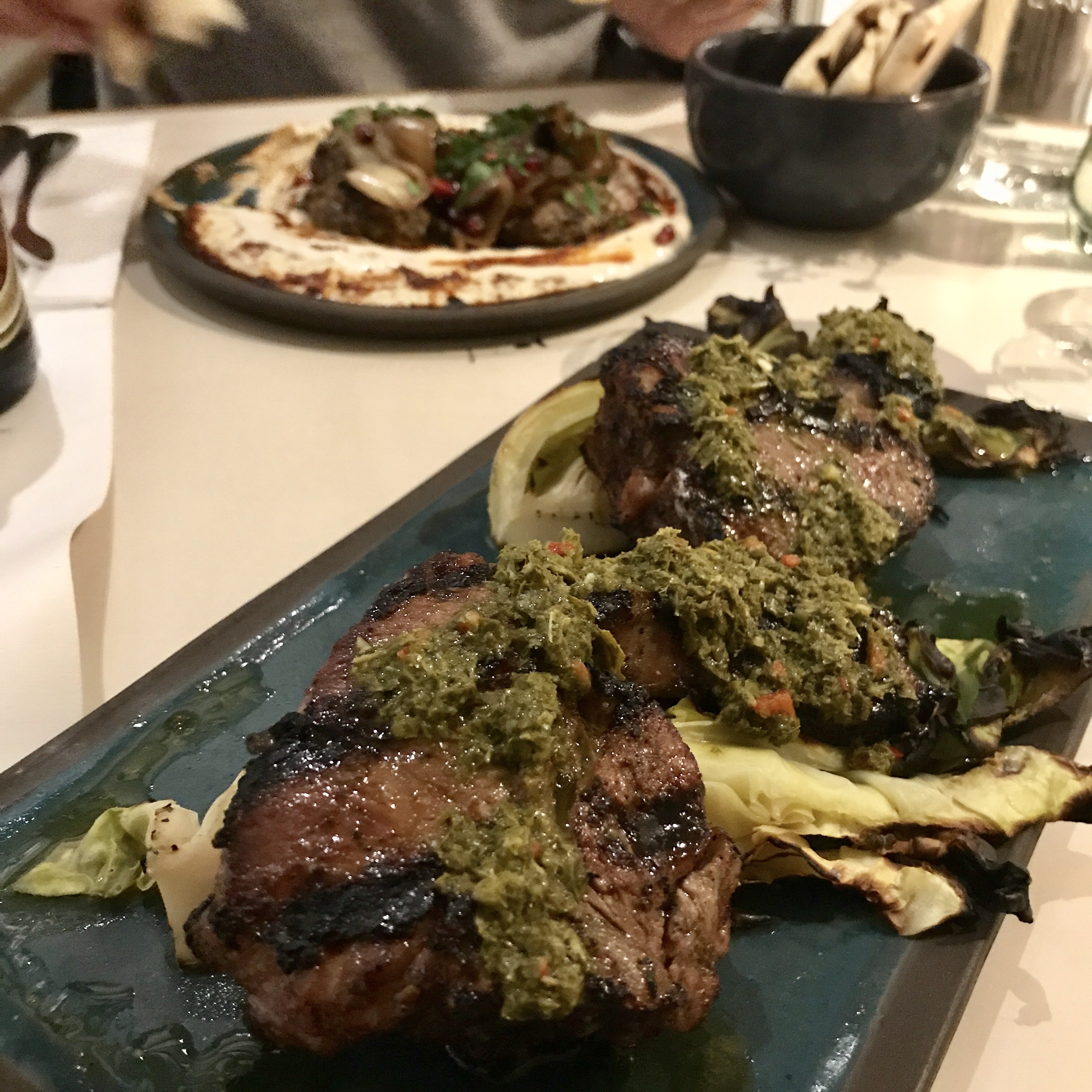 lamb chops marinated in kabsa spices & plums then grilled, charcoaled hispi cabbage, vine leaves chimichurri