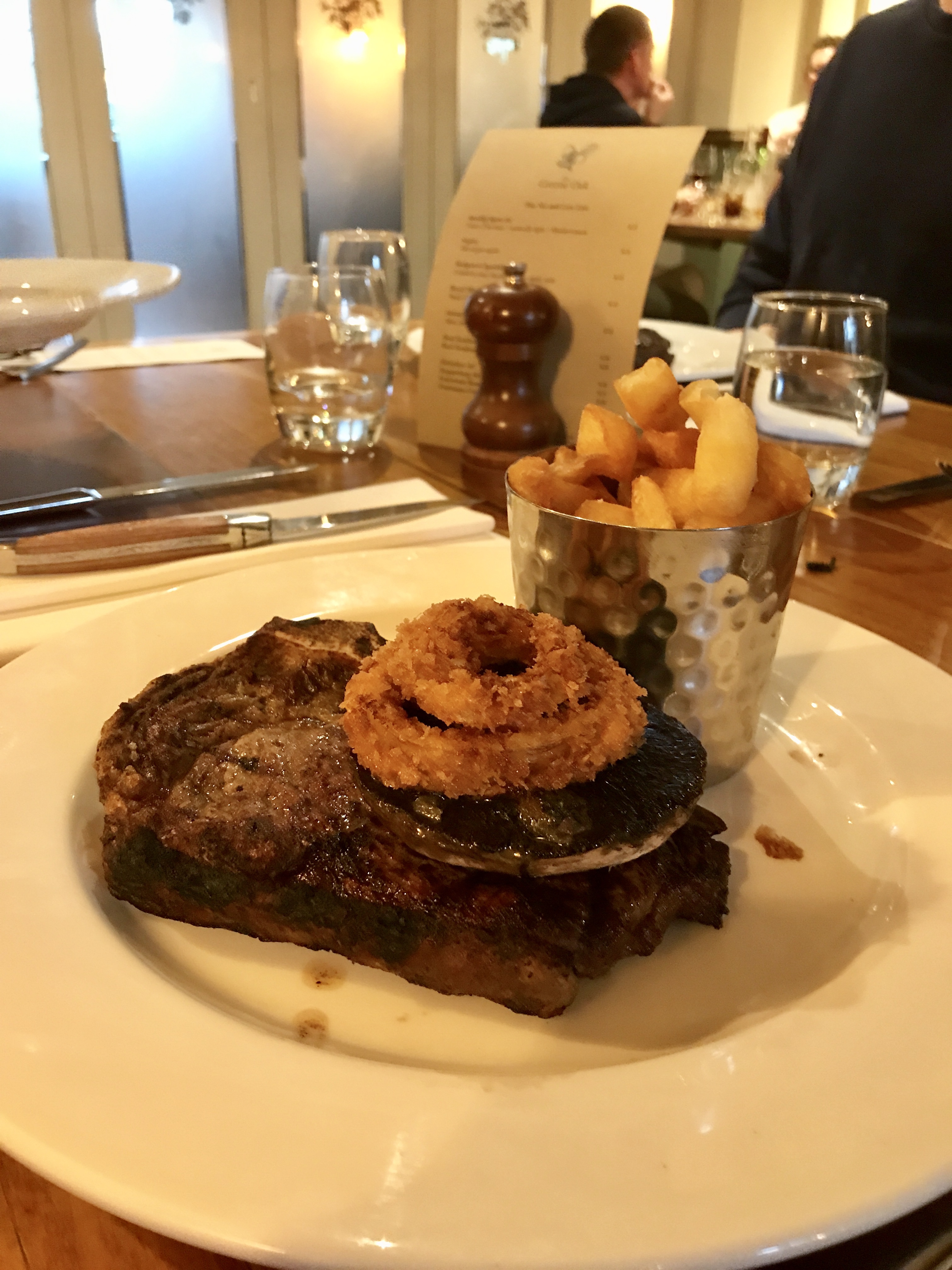 two 45 day aged rare breed steaks with bone marrow mushrooms, onion rings, triple cooked chips –